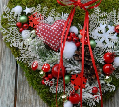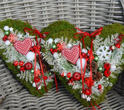 Bohatě zdobené vánoční srdce na mechovém korpusu ve tvaru srdce....