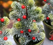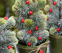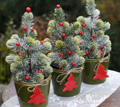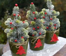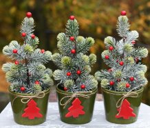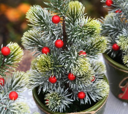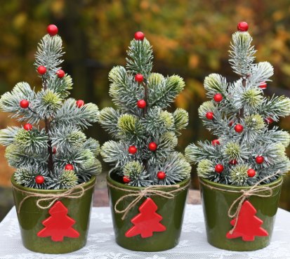 Krásný vánoční stromeček z umělého jehličí je zasazen do keramického květináče