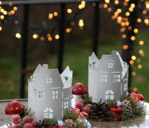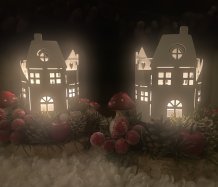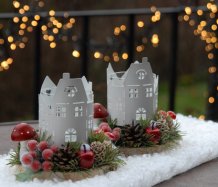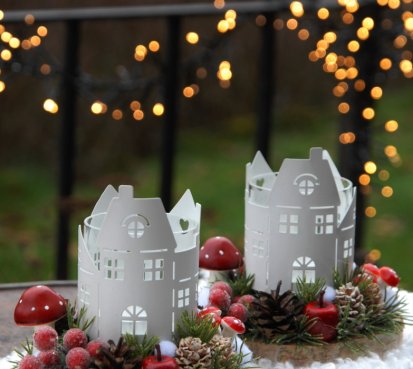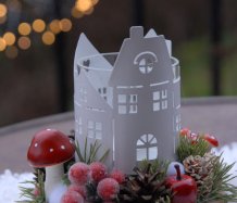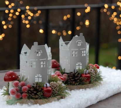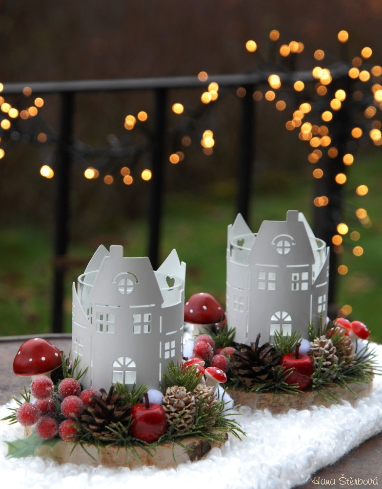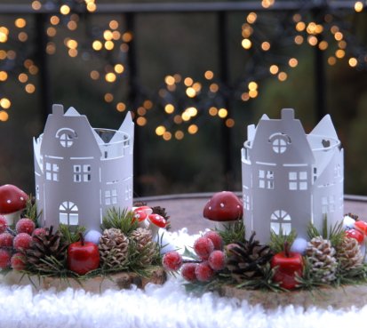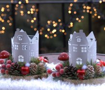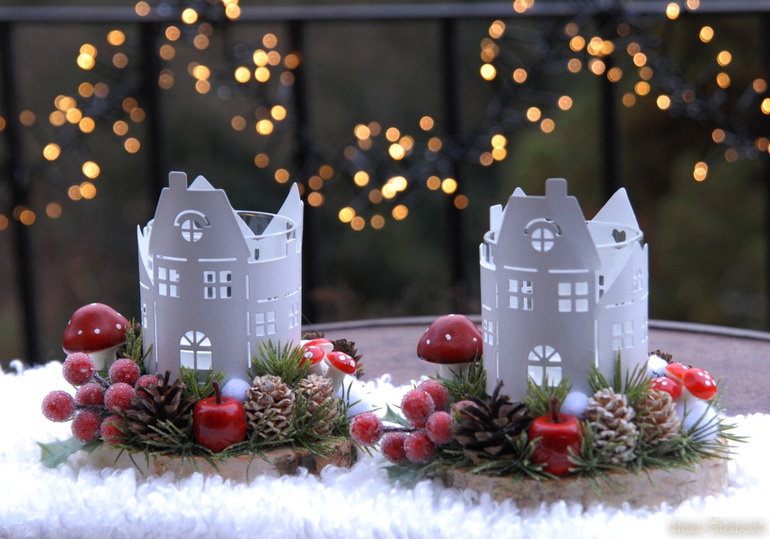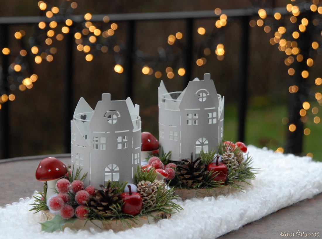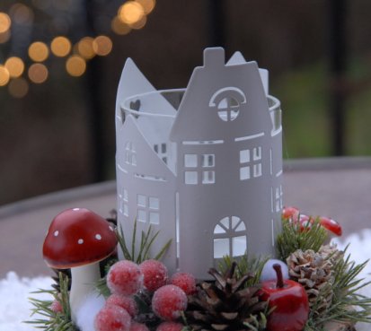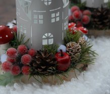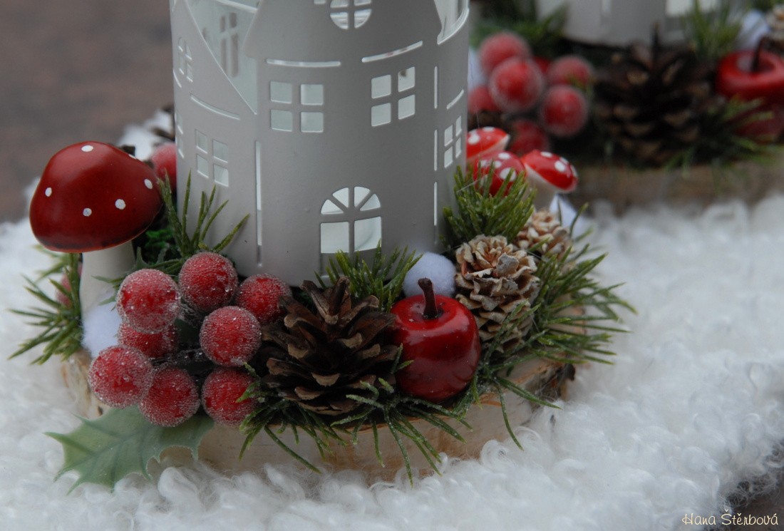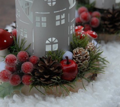 Svícen je naaranžován na dřevěné kulatině, bohatě ozdoben vánočními přízdobami a přírodninami....městečko je plechové ....čajová svíčka k tomu