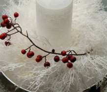 Sněhobílý svícen je naaranžován na stříbrném, kulatém podnosu. Bílé větvičky okolo svíčky jsou umělé. Svícen úžasně navozuje vánoční atmosféru