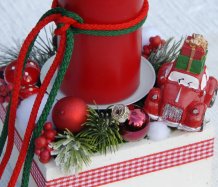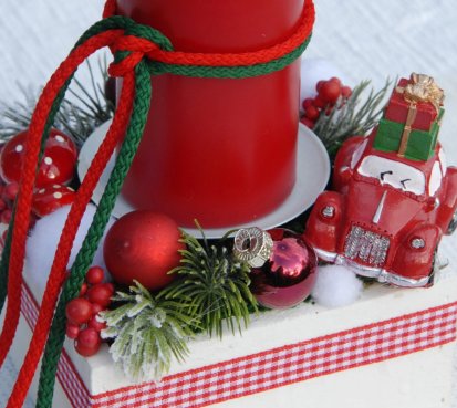 Krásný svícen v dřevěné bedýnce s vyměnitelnou svíčkou a spoustou vánočních přízdob a autíčko k tomu