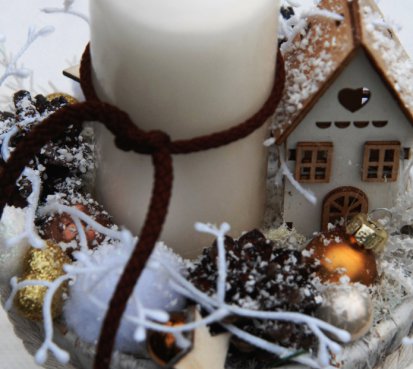 Svícen je ozdoben vánočními přízdobami a krásnou chaloupkou....svíčka na bezpečnostním bodci je vyměnitelná