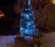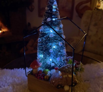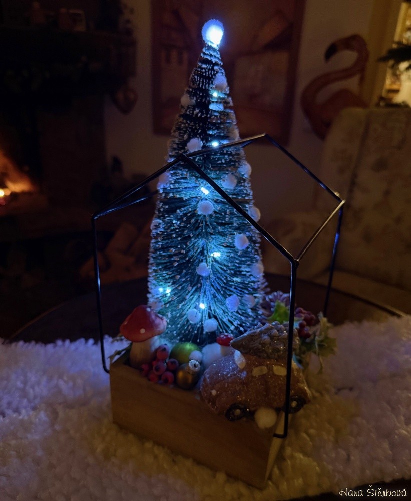 Domeček je vyroben ze dřeva a drátů, nazdobeno umělým stromečkem, vánočními přízdobami, keramickým autíčkem
