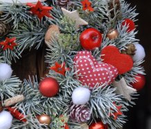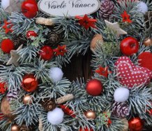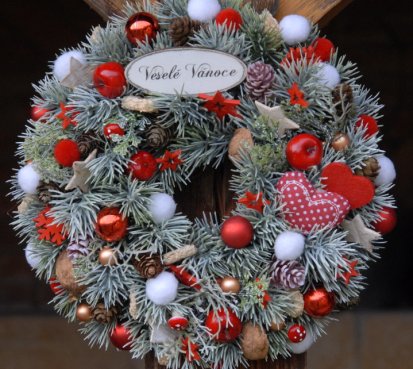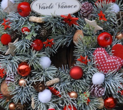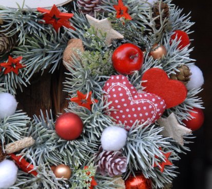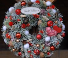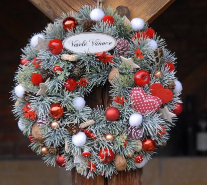 Věnec je vytvořen z umělého jehličí, bohatě zdoben vánočními přízdobami, látkovými srdíčky, cedulka je dřevěná