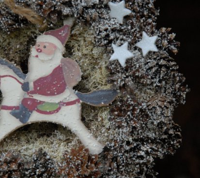 Šiškový věnec je jemně zasněžen a ozdoben krásným dřevěným Ježíškem