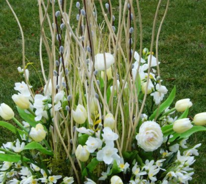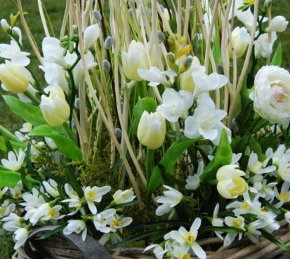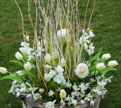 Jemně patinovaný koš je naplněn krásnými umělými květinami, kočičkami, proutky. Krásná jarní dekorace do Vašeho interiéru