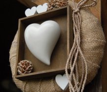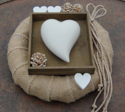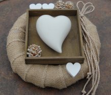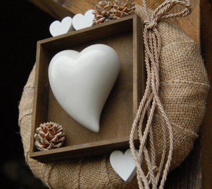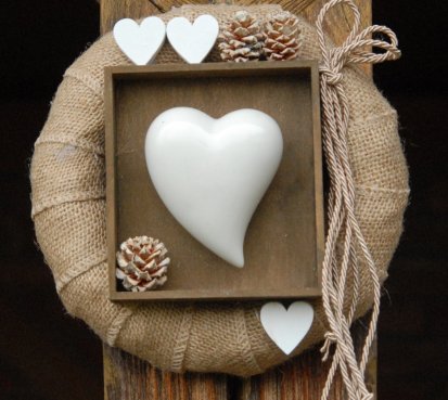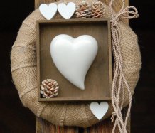 Věneček je vytvořen na pevném slámovém korpusu, omotán jutou....keramické srdce v dřevěné krabičce..