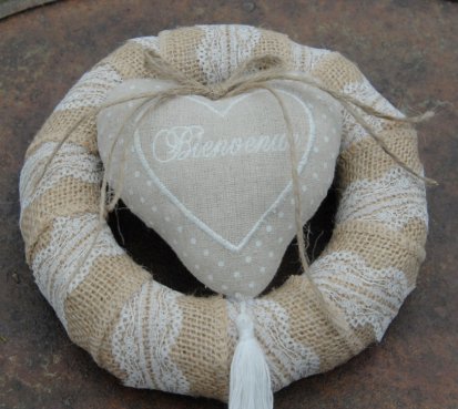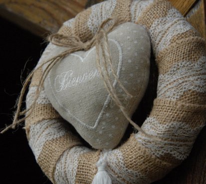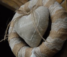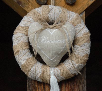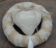 Věneček je vytvořen na pevném slaměném korpusu omotán jutou s krajkou...krásné přírodní srdíčko k tomu....