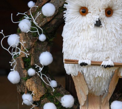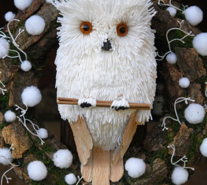 Pevný korpus z kůry a mechu, je ozdoben chlupatými kouličkami...na vše dohlíží krásná bílá sova