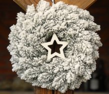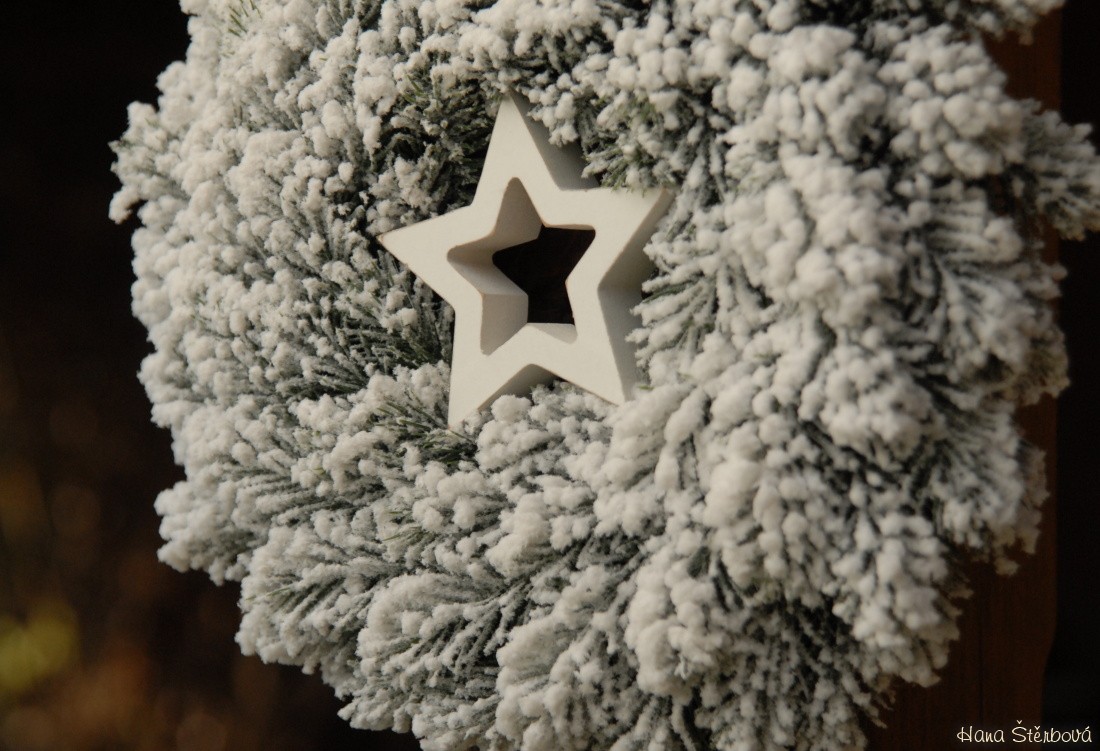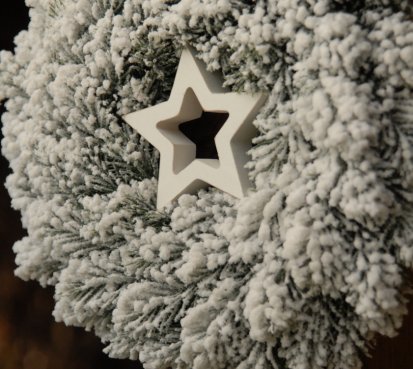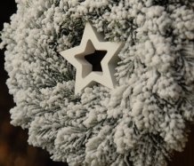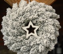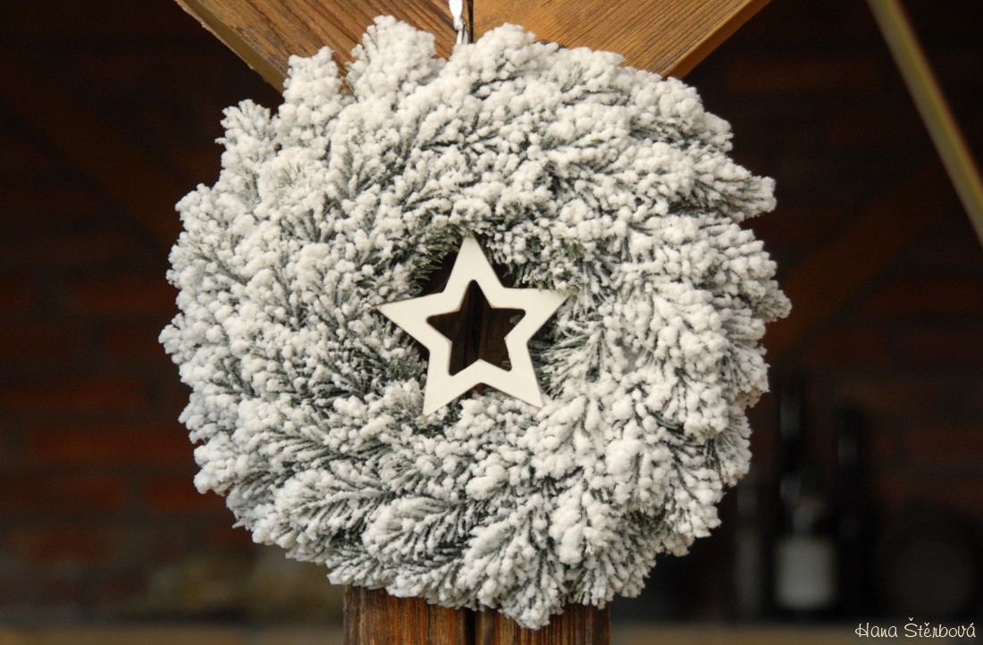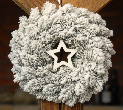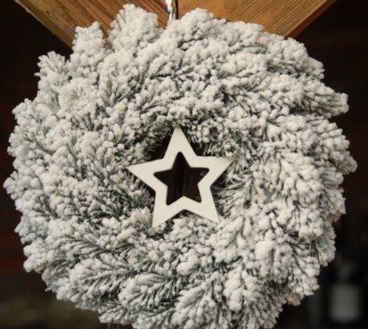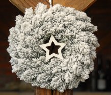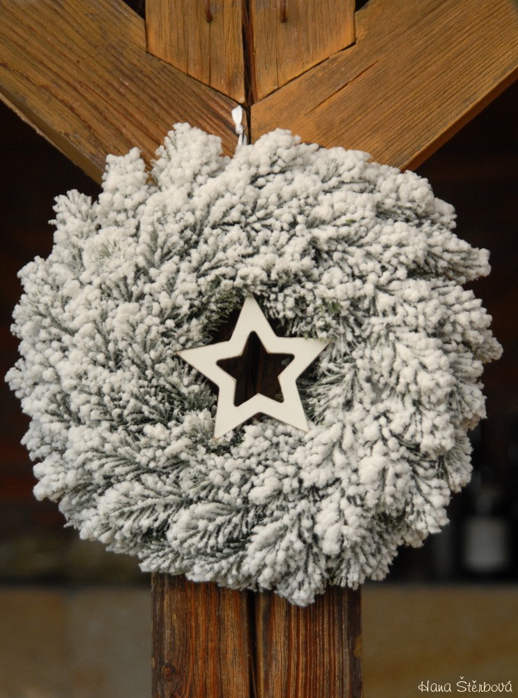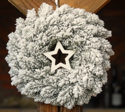 Věnec je vytvořen z umělého jehličí, bohatě zasněžen.....s krásnou dřevěnou mohutnou hvězdou